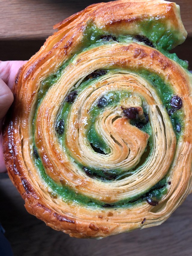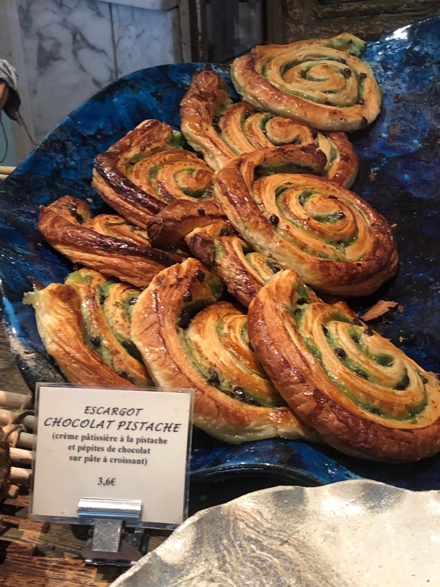 It does not have snails in it. Just shaped like one of the cute little guys. It’s a perfect combo of croissant dough, pistachio flavored pastry cream, and mini chocolate chips. If you like pistachio ice cream/gelato, you’ll love it. If not . . . I guess just feel sadness. It’s sort of like a pain aux raisin, except it’s good because there are no raisins.