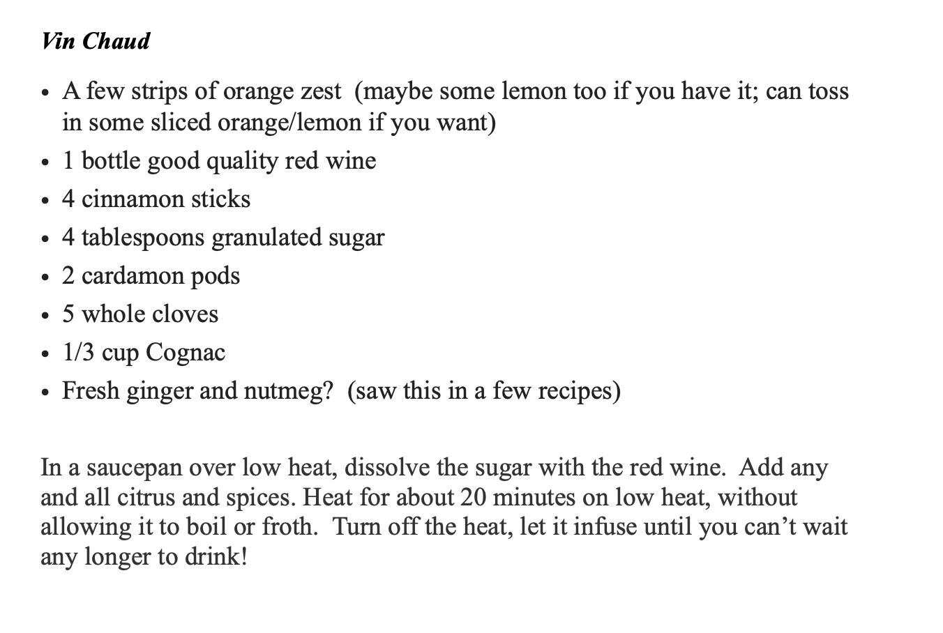One of the things I’m taking home is Vin Chaud (mulled wine). We ordered it at every lunch on the mountain, and it was a little different each time. I’ve been researching recipes, and will experiment all next winter to perfect it, but here is the general idea: