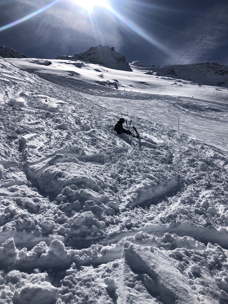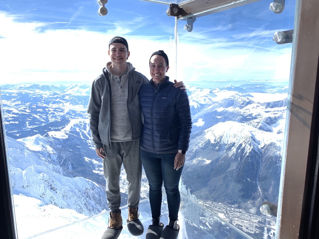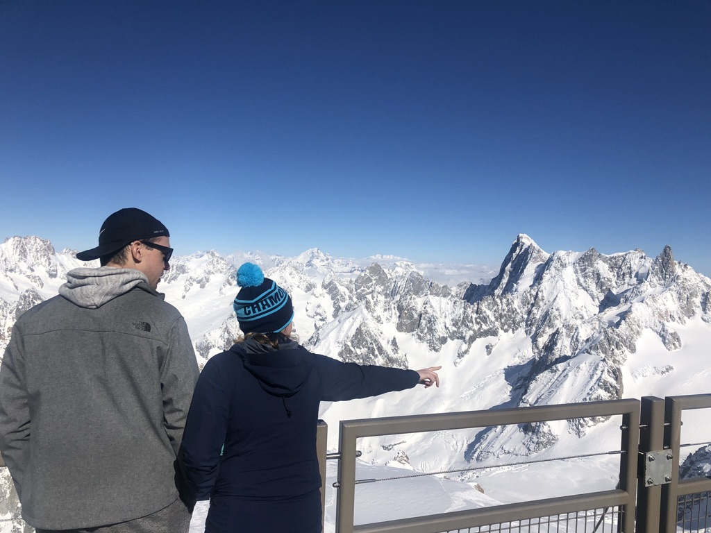 The below photos are from our terrifying trip up Aiguille du Midi. Terrifying because you take two gondolas up to about 12,600 feet. The second gondola is not supported by anything but the cable, holds like 60 people plus a heavy gondola, and travels vertically at the end, then it stops for what I’m sure was an eternity, the wind blows you around and you bounce off the side of the mountain a little. Then you look straight down, and wonder if anyone has died doing this today. On the left, we are standing above the “void”, and I’m not happy about it. On the right, CJ showing us her off-piste ski route down to the valley floor. Which is nuts, btw. Once I get comfortable with 3-ft jumps, I’ll try it.
