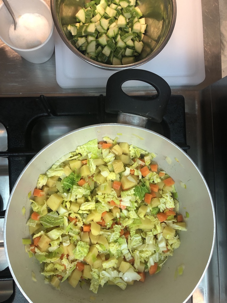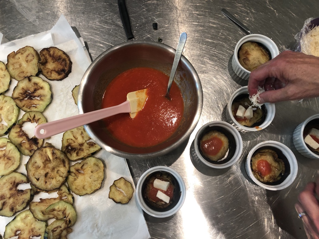 Today we made minestrone soup, lentil soup, eggplant parmesan, and an eggplant mousse with chocolate ganache (not as weird as it sounds). Lots of dicing veggies today.
