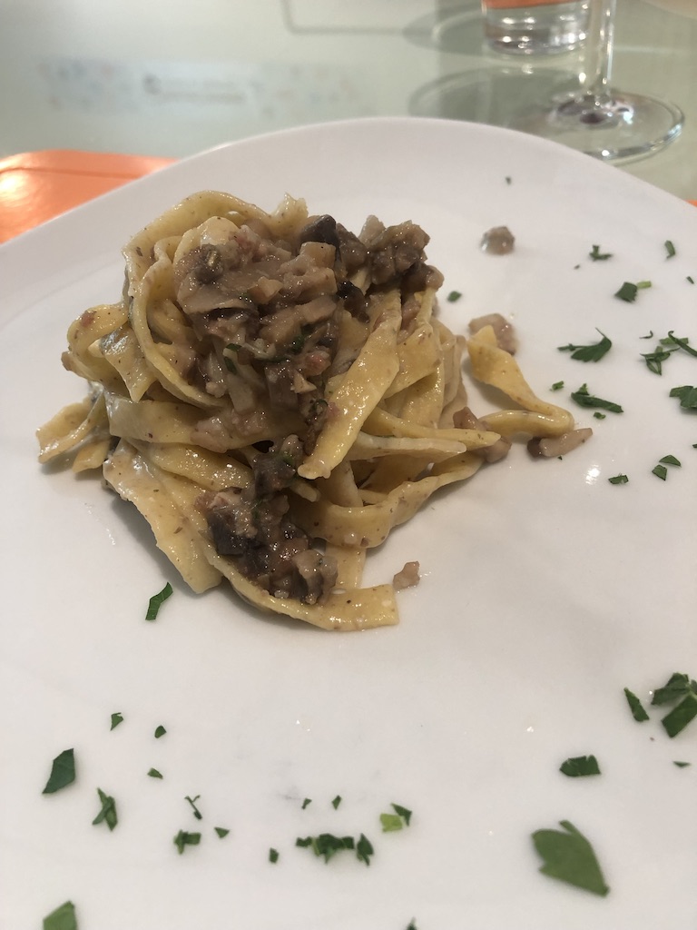 With the hazelnut pasta we made a mushroom sauce with pancetta, shallots, and herbs.