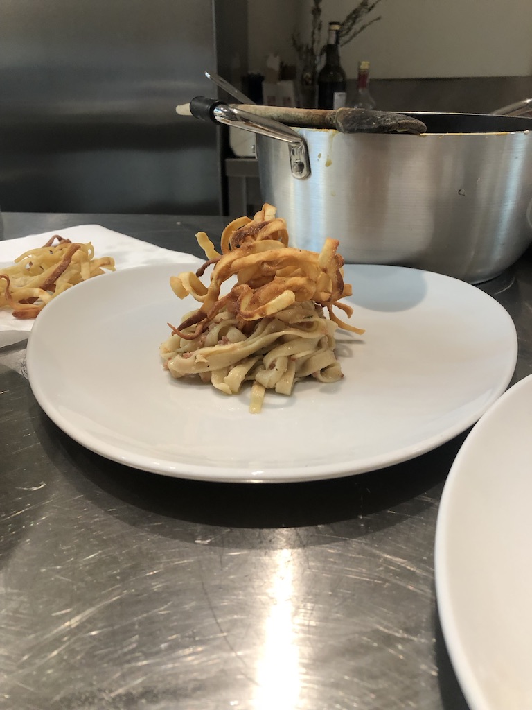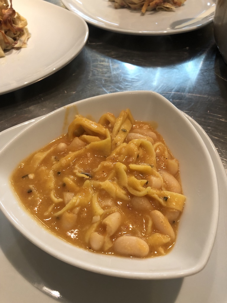 We ended up with pasta and fagioli (pasta and beans) two ways. The traditional way which is a soup with beans and noodles, and then a fun new way, where we made the pasta dough with bean puree. This was our favorite dish of the day. Probably because we fried some of the pasta and put it on top.
