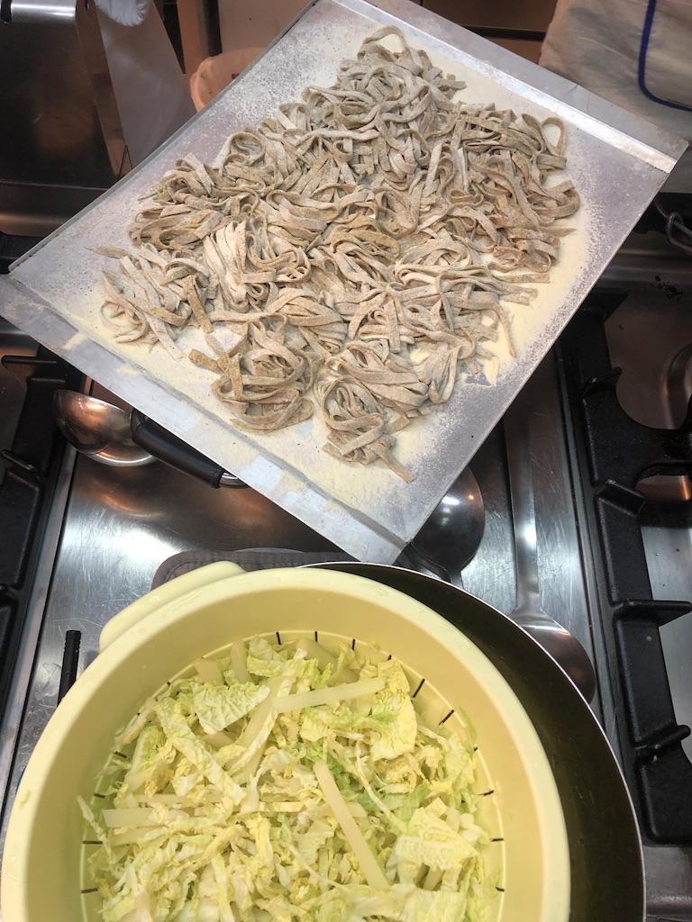We used the buckwheat to make Pizzoccheri, which is traditioanlly from a valley in Italy up north by Switzerland. It’s a baked pasta with buckwheat pasta, cabbage, potatoes, and cheese.