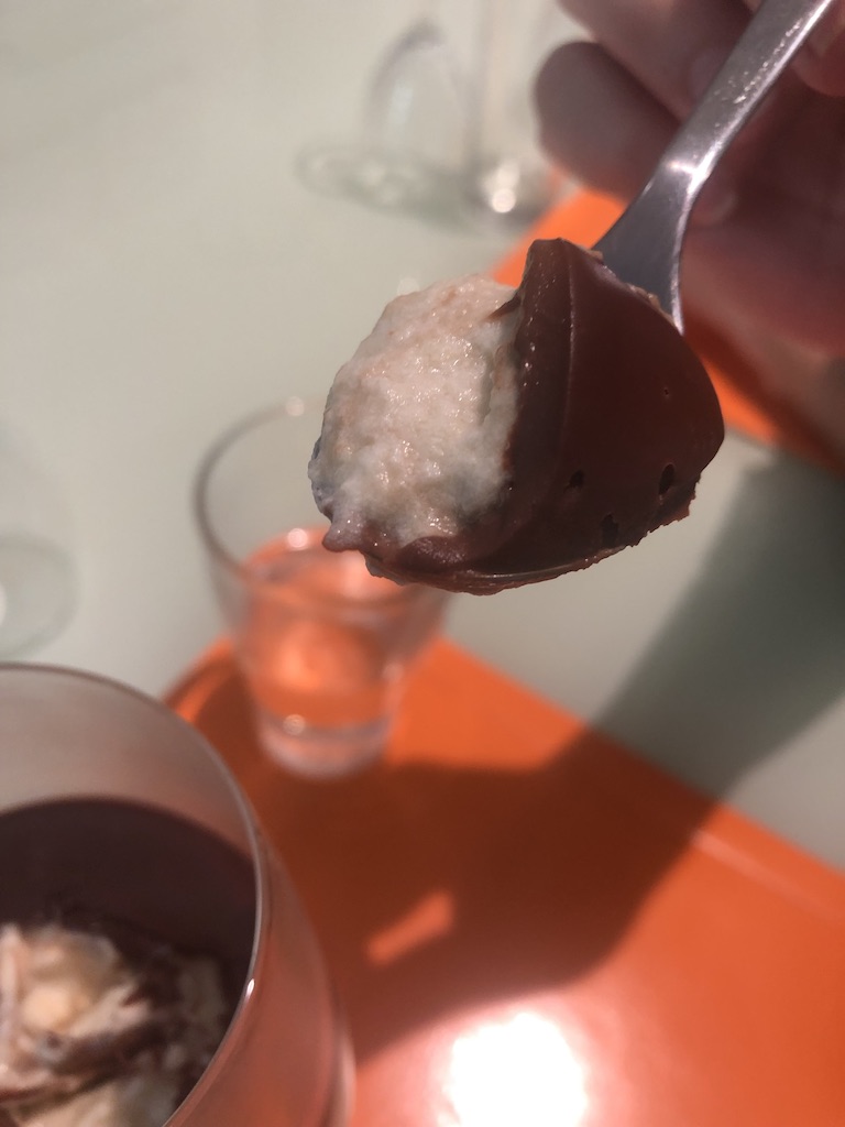 Finished lentils (really easy), eggplant parm (compared to what we are used to eating in the U.S., there is very little parmesan in the traditional recipes), and the mousse with ganache.