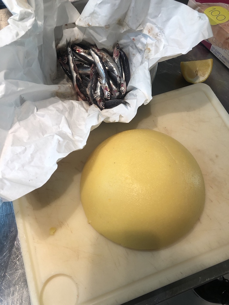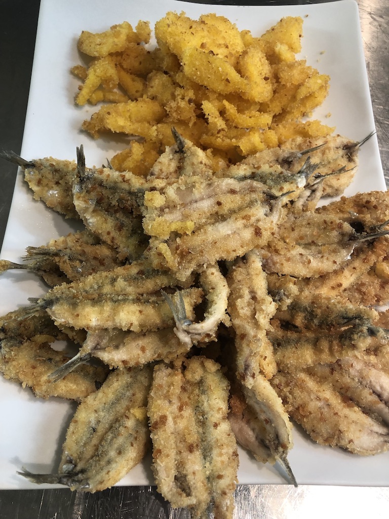 Here are the anchovies before, pictured with a beautiful polenta dome (we put the cooked polenta into a metal bowl with a little water in the bowl to cool and it popped out of its mold perfectly), and after they were fried (with a little fried polenta).