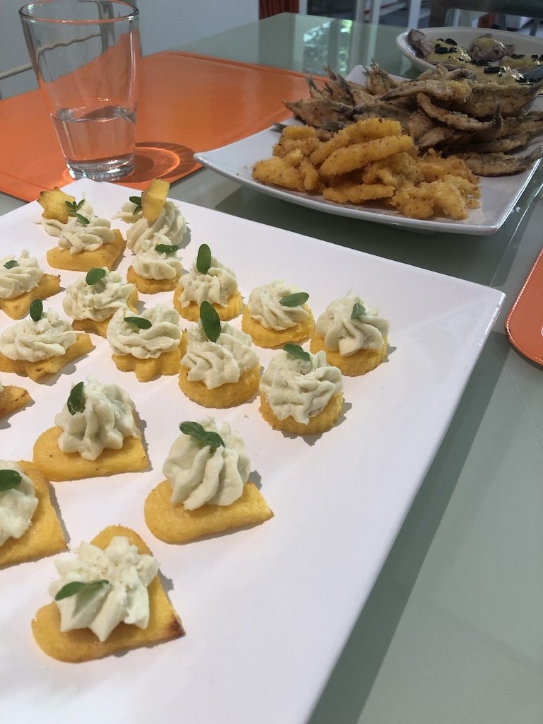 Below are most of the finished products. In the foreground, polenta cut into cute shapes and topped with salted-cod mousse. In the back, veal with tuna mayo (weird, but tasted pretty good).