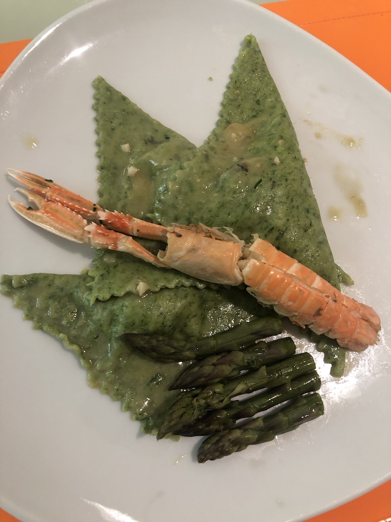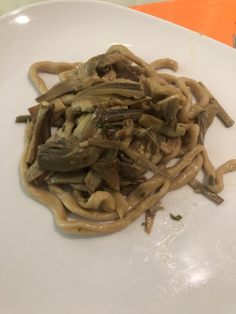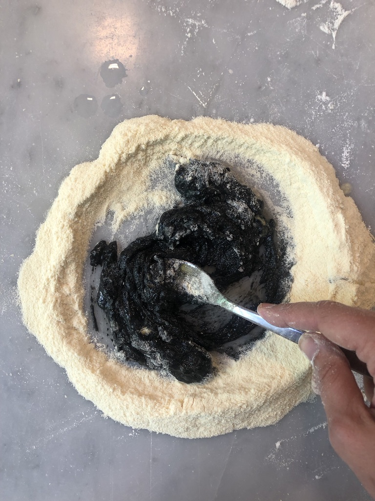 More pasta! We made spinach triangles filled with asparagus and shrimp, blank ink pasta with cuttlefish (we cleaned the cuttlefish and tried to use the ink, but they sprayed out all their ink when they were caught, so we had to use packaged ink), coffee-flavored pici with artichokes, and red-pepper tagliolini with zucchini.