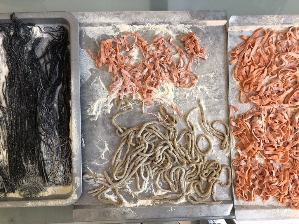 Here are the different pastas. On the left is buckwheat. On the right, there is soy lecithin (squares), then moving clockwise, bean pasta, hazelnut pasta, and regular pasta we made a few days ago.