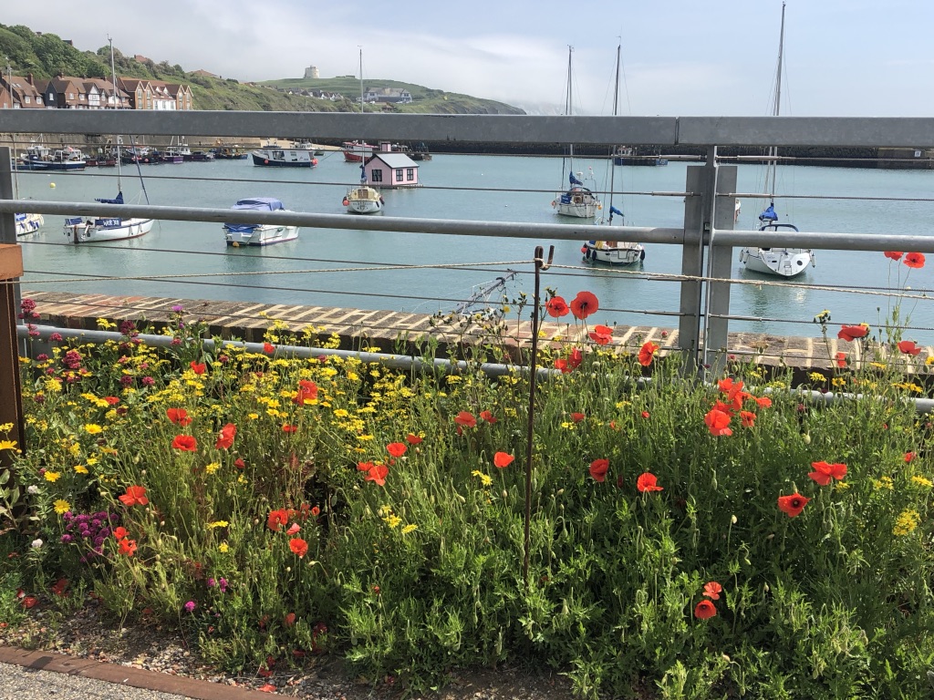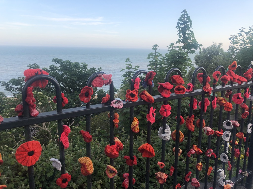 All along The Leas, red poppies — the symbol of remembrance for those who fought in WWI — made of yarn are tied to the railings.