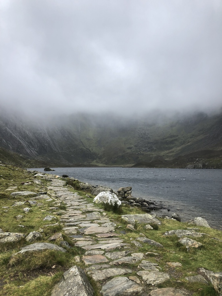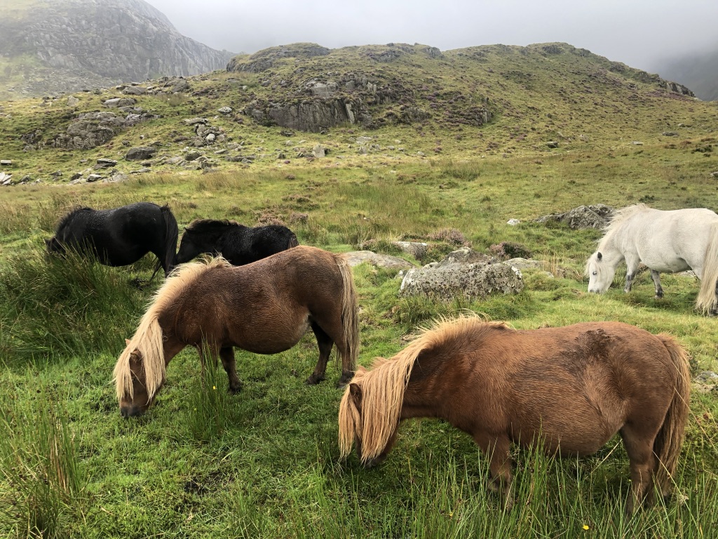 After tea, we went on a hike up to Llyn Idwal (a mountain lake) in Snowdonia National Park, which was possibly the best part of the trip because there were ponies on the trail! They were all very pleasant ponies on the way up, letting us pet them and introduce them to Alice. On our way down, however, they were in a mood. One bit my leg – unprovoked! – with its tiny pony teeth.