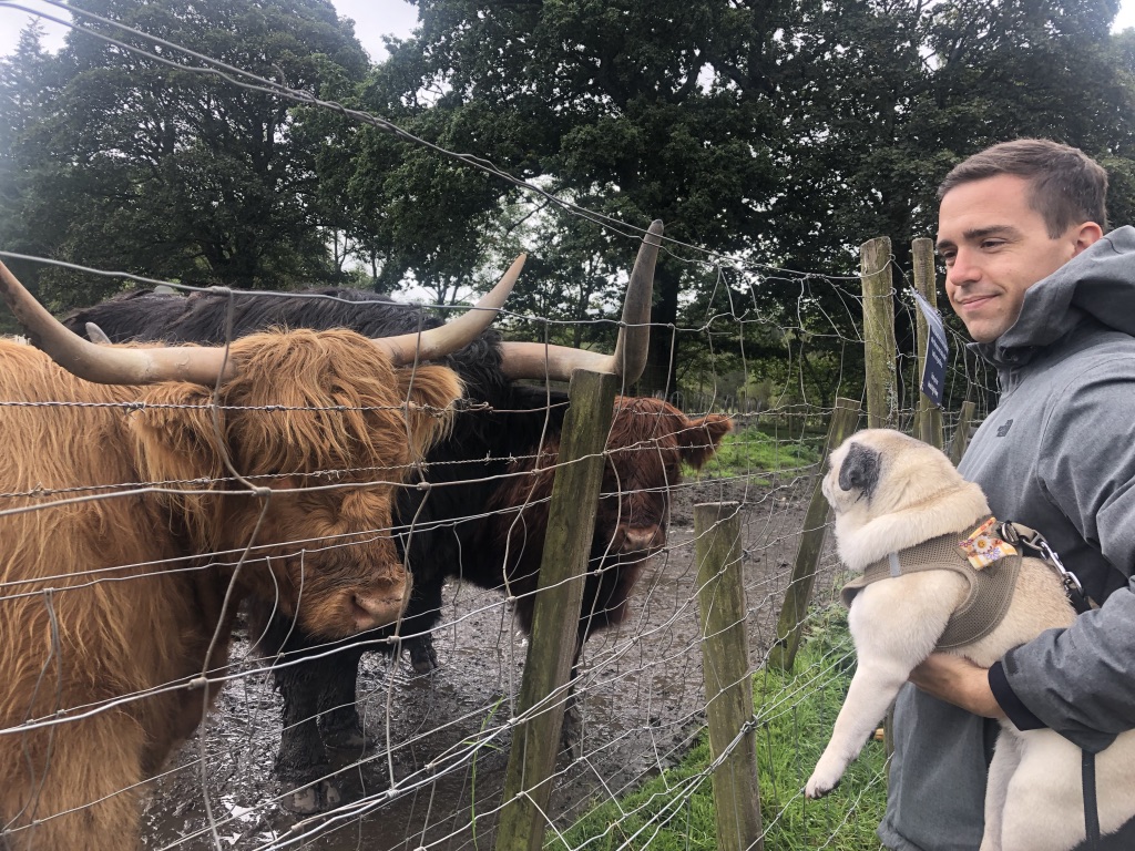 Our very last stop was to see some Highland cows on the way to catch our flight out of Edinburgh. We fed them apples and grass in the rain, and drove to the airport.